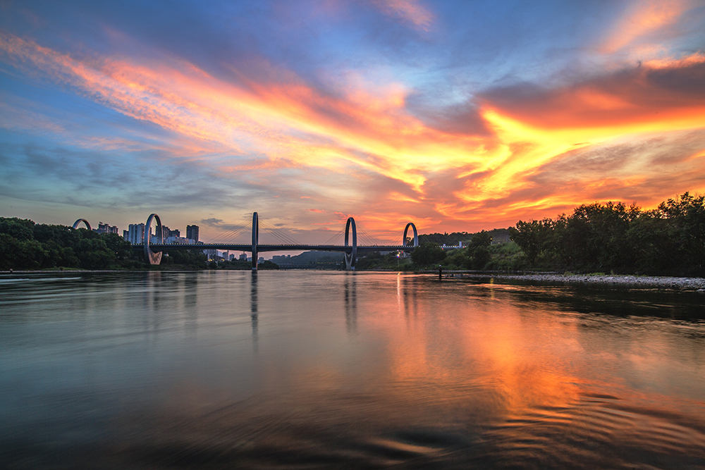 晚霞中横跨澧水的五环桥,桥影如虹,壮美如画。