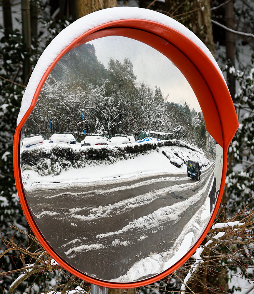 凸面镜本用于扩大视野,保障道路安全。但镜中景却又别有一番风味:积雪覆盖的道路上有车辆行驶,留下道道车辙,仿佛在雪的画布上勾勒出灵动的线条。道路两旁是银装素裹的树木,远处山峦也被白雪晕染,整个画面在凸面镜的反射下,既有雪景的纯净静谧,又因道路和车辆增添了一丝动感,红框与白雪形成鲜明色彩对比,更凸显出这“镜中雪路”的别致意境,仿佛是打开了一扇通往冰雪秘境的窗口,将冬日山林间的道路风景以奇幻的方式展现出来。
