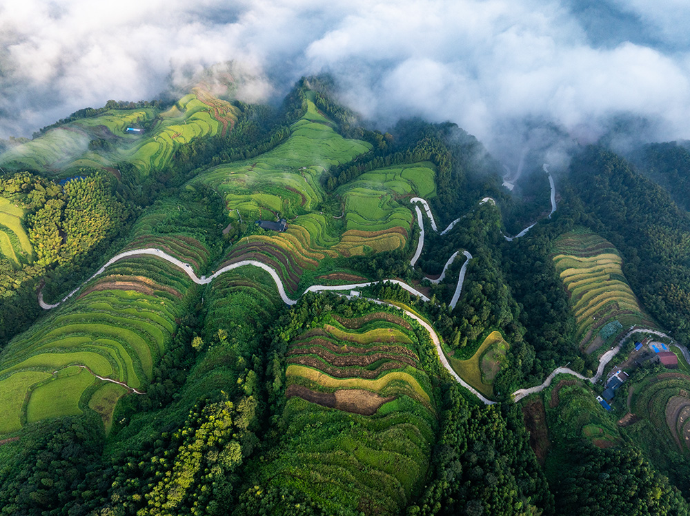 | 2025年9月3日拍摄于堡子届林场。在张家界堡子界的云端秘境里,一曲“公路交响”正于梯田绿海中澎湃奏响。 银练似的公路如灵动的音符,在层层叠叠的翠绿色梯田间蜿蜒盘旋,时而舒展,时而曲折,于山岗谷地间勾勒出优美的弧线。梯田如被大自然调过色的绿浪,深浅不一的翠绿、嫩黄交织成华丽的乐章底色,茂密的山林则是厚重的和声,将这曲“交响”衬得愈发悠远。云雾似轻纱,偶尔漫过山坡,为这曲“交响”添上几分朦胧的诗意,让公路的“银线”在绿意与云霭的交融中,奏响了山与路、自然与人文的动人旋律。 |