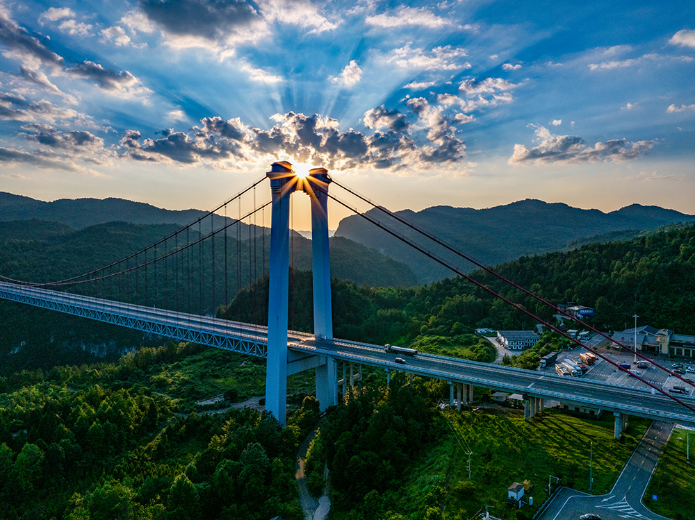 湘西交通枢纽:张花高速澧水特大桥。一头连着张家界的奇峰,一头牵起湘西的秘境,将澧水两岸的峰峦、村落与文脉轻轻连缀。此时束束阳光穿透薄云映照在澧水特大桥上,让这座桥梁显得格外美丽壮观。
