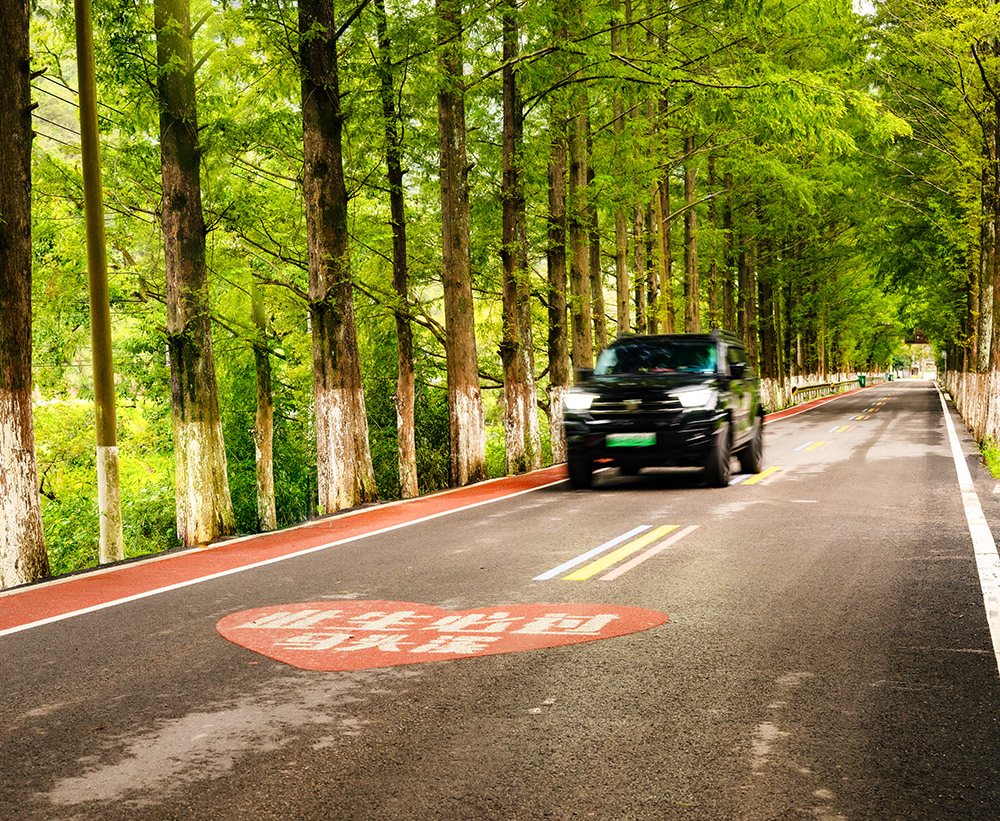 画面展现的是张家界永定区远古坪码头溪的公路,道路两侧是高大挺拔的树木,形成一条绿意盎然的林荫廊道。路面有红色爱心图案的标识,一辆黑色汽车行驶在公路上。整体环境清新自然,公路在绿树的环绕下宛如一条穿梭于林间的景观道,充满生机与诗意,尽显“最美公路”的雅致与灵动。