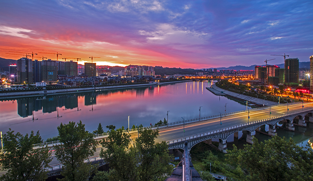 2022年5月拍摄于张家界市沿河大道。清晨沿河大道如金银彩带,澧水映朝霞,车流织星河,共绘张家界晨路之魅。
