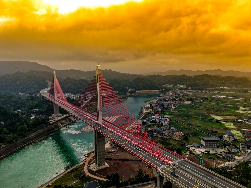 桑龙高速帅乡特大桥位于洪家关南岔村,是桑龙高速的控制性工程,该桥全长1077米,主桥565米,桥面宽29.2米,为双向四车道设计,全桥斜拉索共184根,总重100吨。