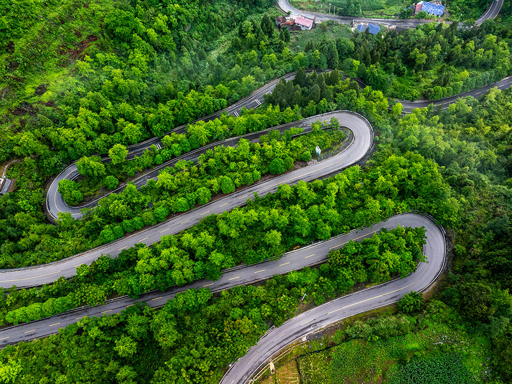 2025.06.15摄于张家界市永定区天门山镇小坪村。层叠的绿意将山路拥入怀抱,蜿蜒的公路如银带在林海中肆意舒展。