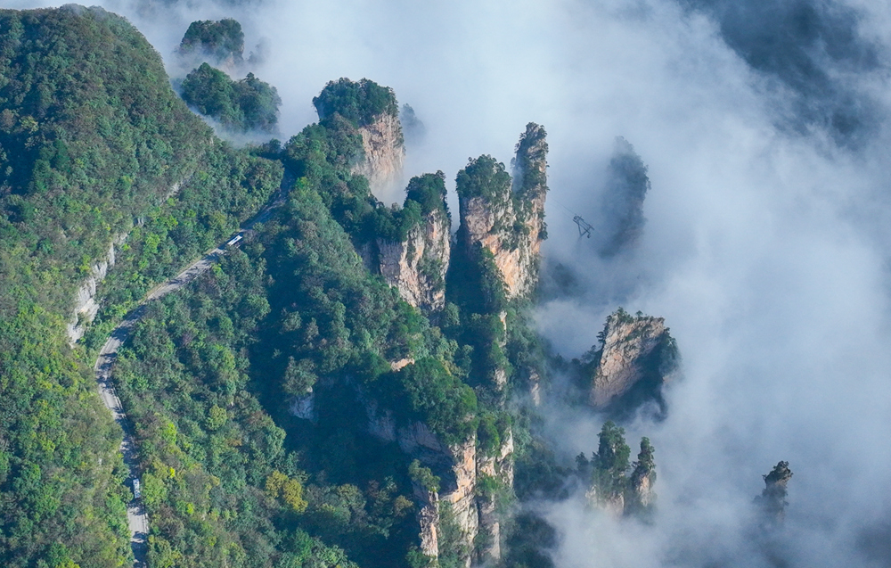 武陵源景区两园路(贺龙公园至后花园)是连接天子山、杨家界、袁家界三大精华景区的唯一公路交通通道,每年有数百万游客往来其间,尽享世界遗产地之美。公路沿线奇峰耸立,阡陌纵横,如诗如画。