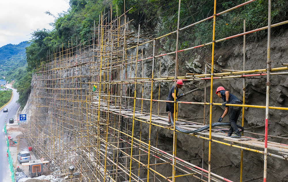 25年9月摄于省道518长潭河路段,防泥石流工人在岩壁上浇灌水泥浆。