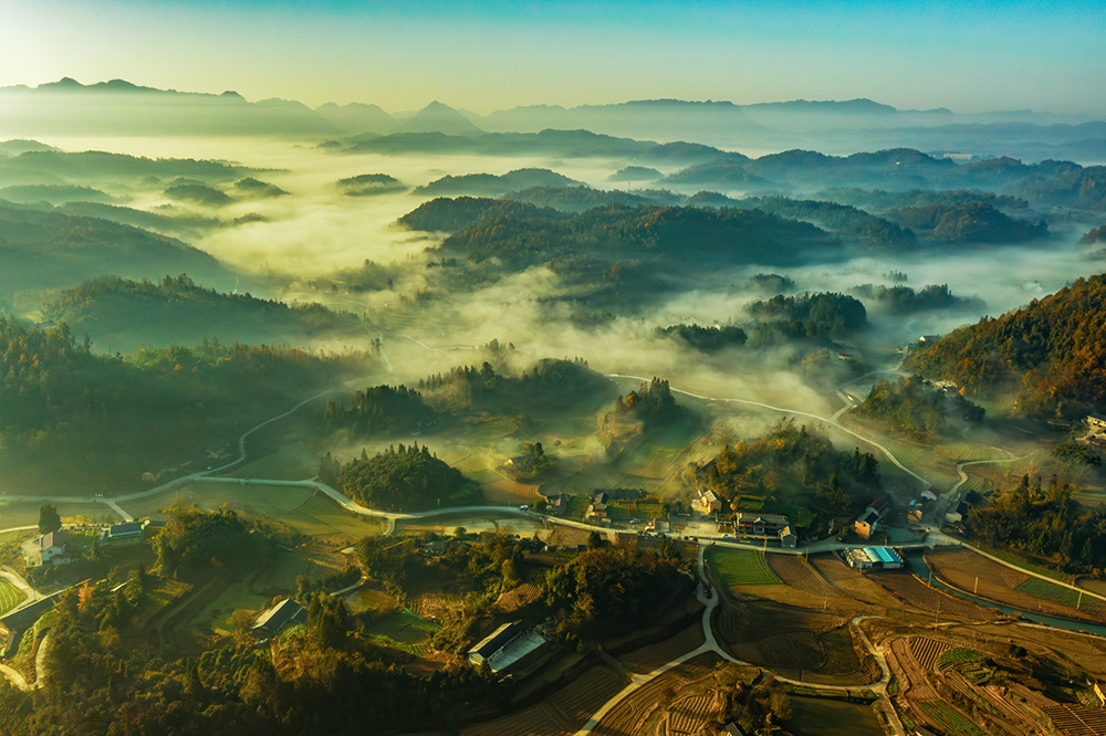 图片为张家界永定区沅古坪烽火村航拍景观,晨雾在山峦、田野间弥漫,层层叠叠的山峦与错落的村落、田园、道路相融,晨光洒下,云海与秋色交织,宛如一幅静谧秀美的山乡田园诗画。