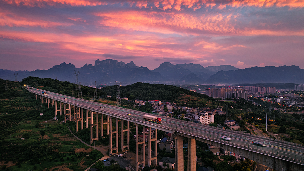 天门山如黛色远屏,横亘张家界天际;高架桥似七彩飞虹,轻卧城区边缘。车流携风穿向湘西,轮胎碾过的不仅是通途,更是将山城烟火与天门奇景缝缀的线 -﹣白日里,山影随路动;暮色中,灯火映山明,连风都带着"城依天堑,路通山海"的舒展。