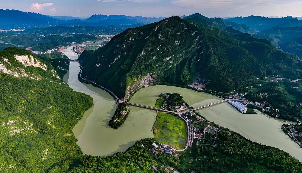 山拥江湾水映峰,路穿翠色入怀中;兴正好逐新梦,尽在层峦画卷中。