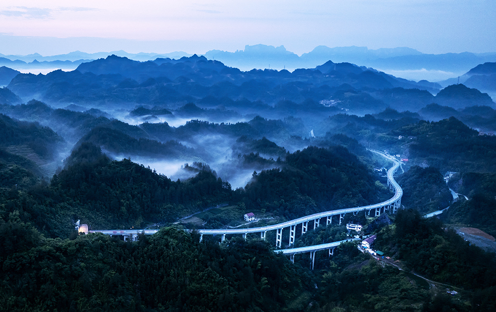张家界市武陵大道,是通往核心景区枢纽,蜿蜒群山间,雾绕裹青山,桥路相映,展山水间交通胜景之幽美。