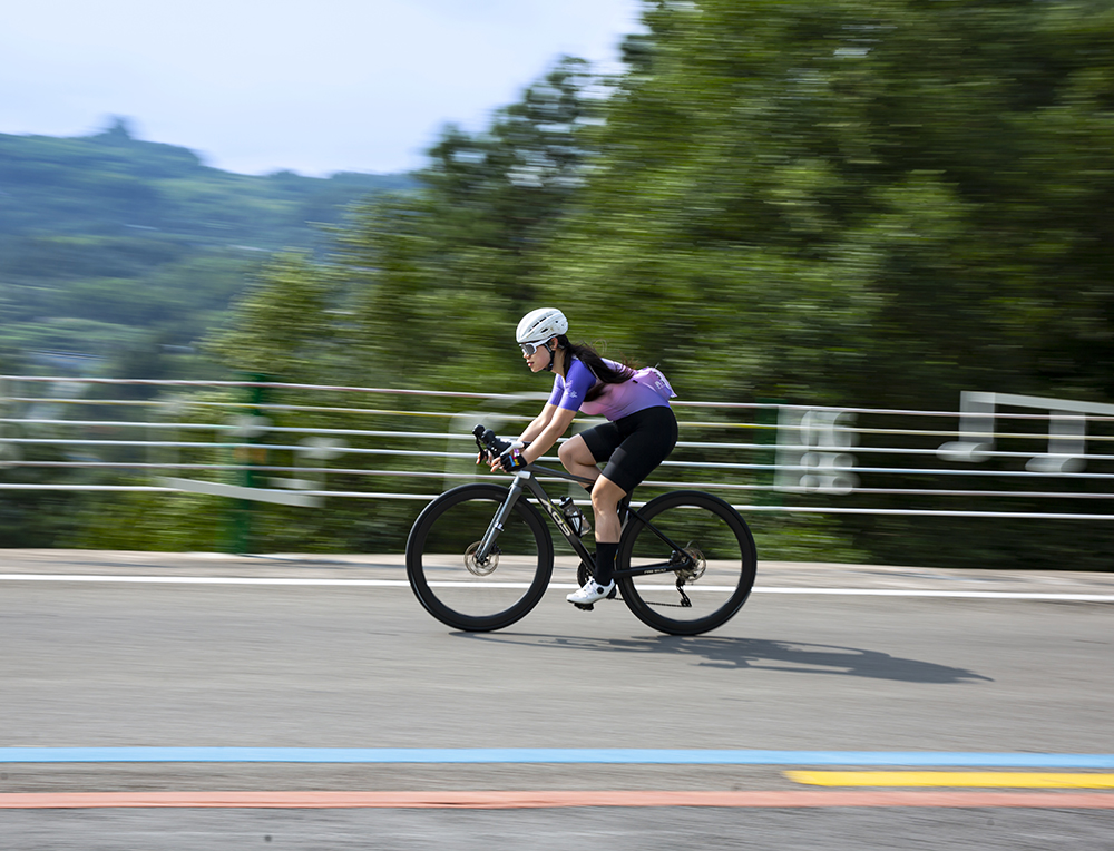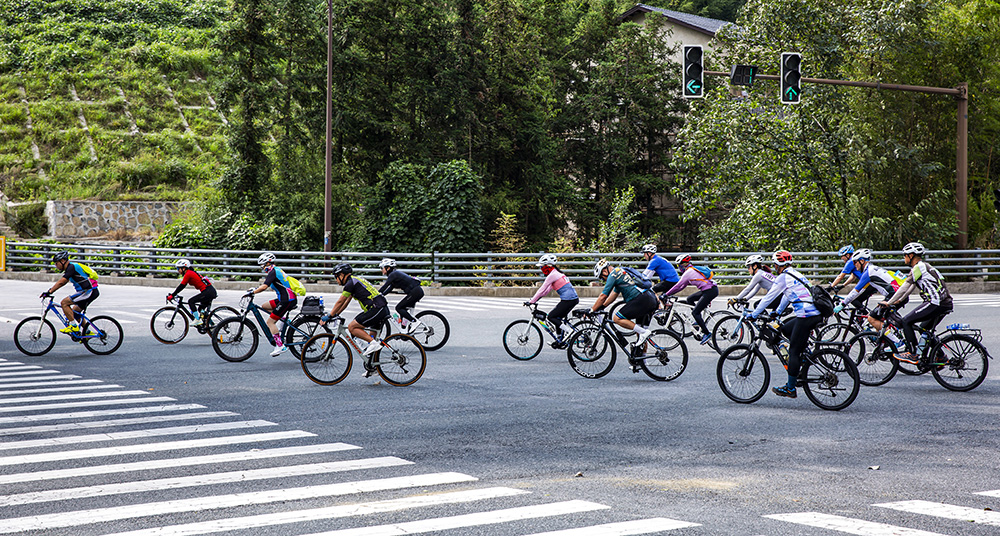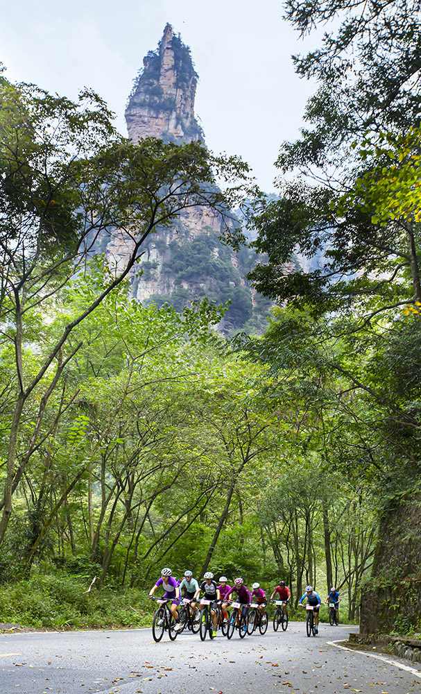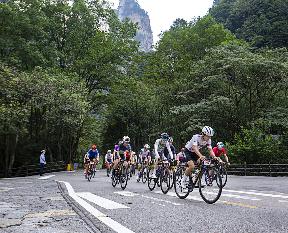 骑士们在武陵源的公路上骑行赛跑,强身健体。