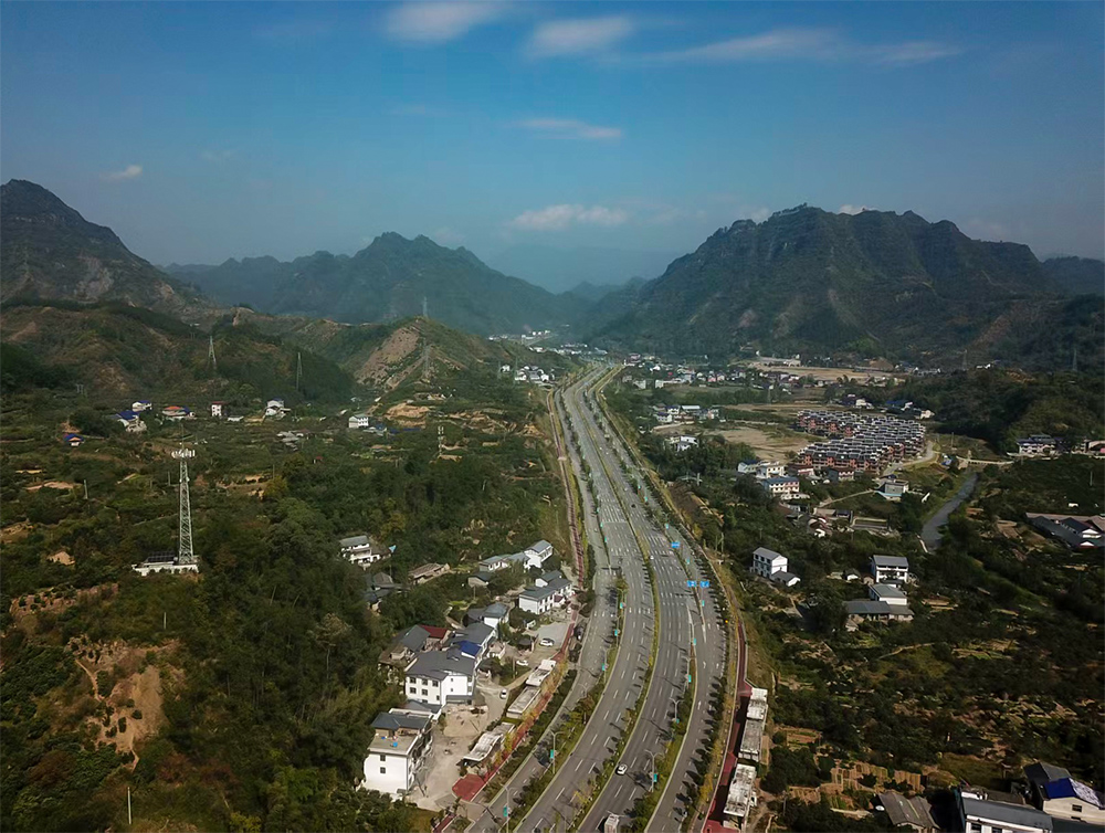 这是张家界通往武陵源的公路.画面中公路穿行于山恋与村落之间,一则侧是层叠的黛色山体,一侧是散落的民居,澄澈蓝天作衬,既展现了这条公路串联景区的交通功能,也融合了张家界武陵源之间的自然秀灵与烟火气息。