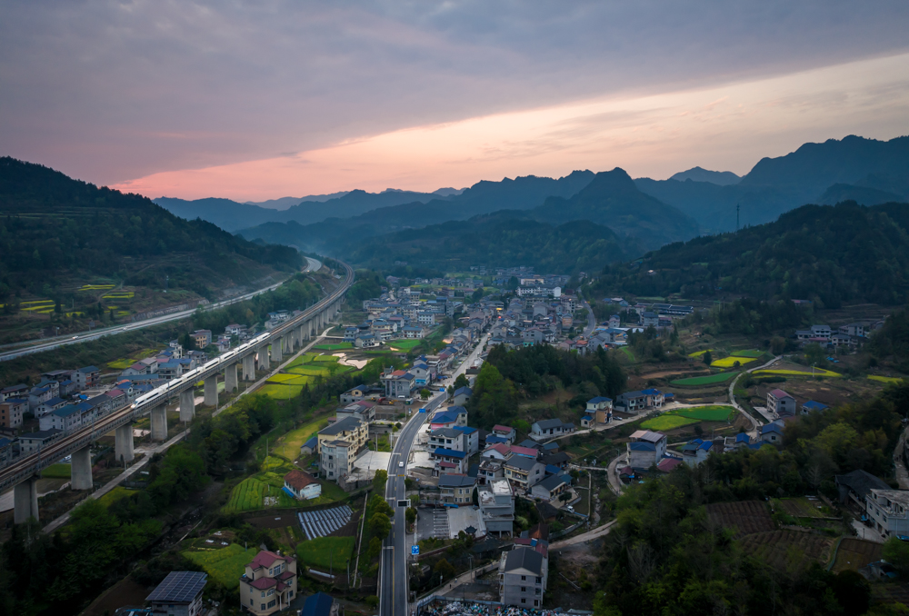 在永定区桥头乡,铁路、高速公路和国道从小镇穿过、山峦像条流动的珍珠链,层次丰富。落日时分,色彩很有氛围感,粉紫晚霞,黄色油菜花配青绿山水,冷暖撞色,光影让建筑、铁轨的轮廓都立起来了,主题把现代交通、希望的田野、远处的山峦和美丽的村庄融合感拉满,能让人感受到乡村振兴与时代发展的脉搏!