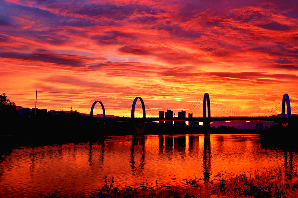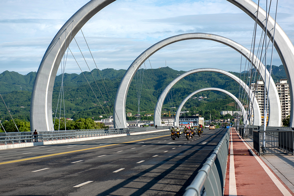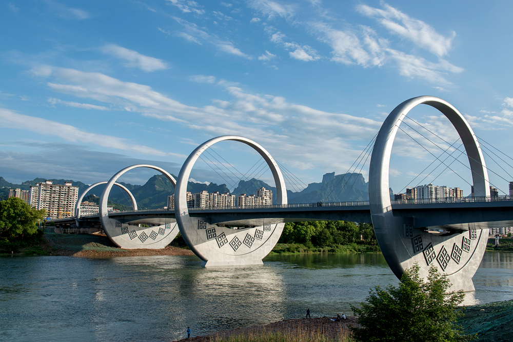 张家界永定区五环桥于2021年启动建设,历时一年竣工。桥梁主体采用钢结构连拱技术,以层叠圆环贯穿澧水两岸,巧妙化解城区交通瓶颈。如今它不仅是连通澧水两岸的民生纽带,其镂空环形结构更与天门山遙相呼应,夜幕下霓虹闪耀,成就网红新地标。