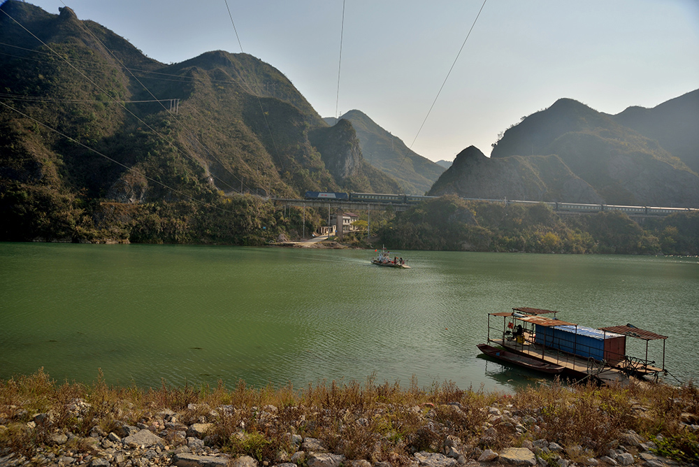 火车穿越被外媒意外爆红的火车五连洞景点,边上澧水上的渡船也很繁忙。2024.12.14摄于慈利县岩泊渡镇