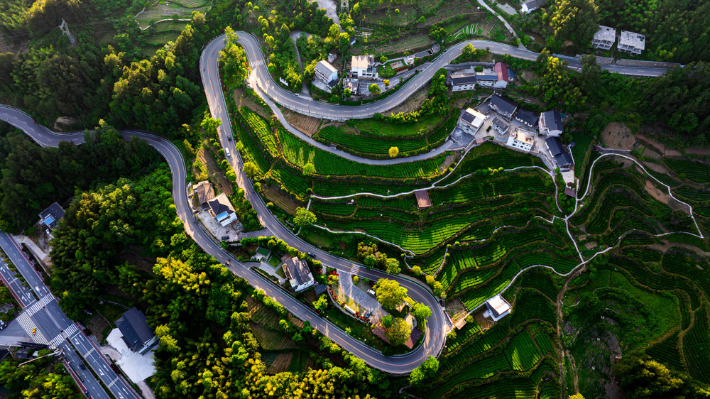 公路在翠绿山林与层层叠叠的茶田间蜿蜒穿梭;屋舍零星点缀,与繁茂草木相映成趣。阳光倾洒时,每一片叶都漾着生机,仿佛自然与人文在此温柔相拥,织就一幅灵动鲜活的山野画卷。