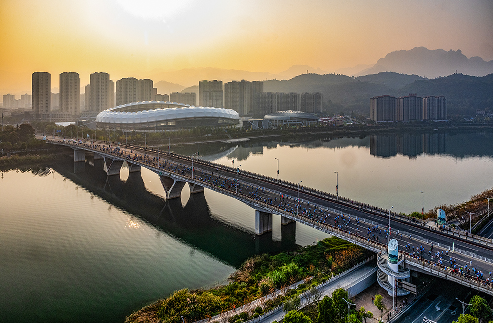 2024年11月3日拍摄。晨光里,鹭鸶湾大桥横卧澧水,桥上车流与人潮(马拉松选手)交织成灵动的线,河岸建筑、山水在晨辉中晕染,桥影与水影相映,好一幅充满活力的晨景图。