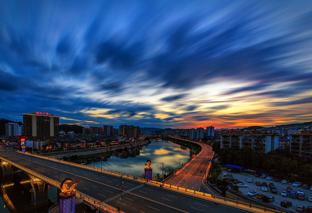 城市公路在朝夕时光里的别样风姿。画面中,公路桥横跨澧水,在晚霞与蓝调时刻的交织中,流云如丝缎般舒展,公路的灯影与城市的霓虹在水面晕染出斑斓画卷