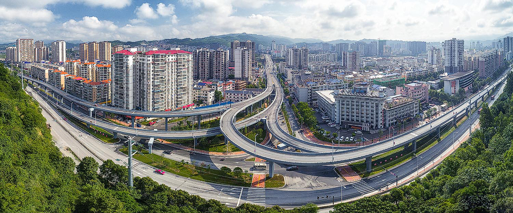 城市立交公路的立体之美。画面中,多层立交公路如银链般在城市中交错穿梭,与高楼建筑群、葱郁山林共同构成一幅极具张力的城市交通画卷