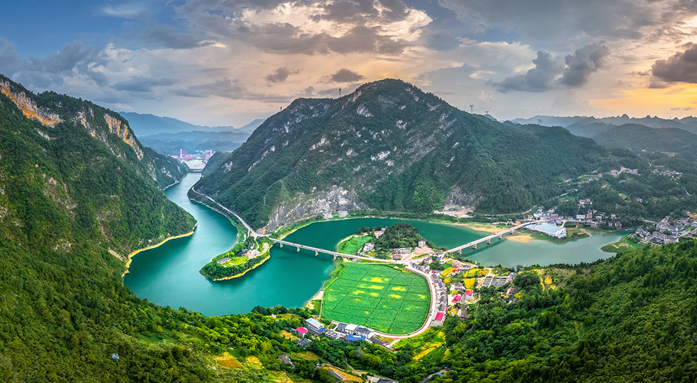 画面聚焦桑植双门岛,公路桥与帅乡高速特大桥遥相呼应,同跨澧水湾,勾勒出 “两桥卧波” 的灵动图景。澧水河穿大山、向平川蜿蜒流淌,为静谧山水注入生机;远处高速特大桥气势恢宏,既显工程之美,更藏帅乡交通发展的活力,自然与人文交融,尽显桑植一隅的壮阔与温婉。