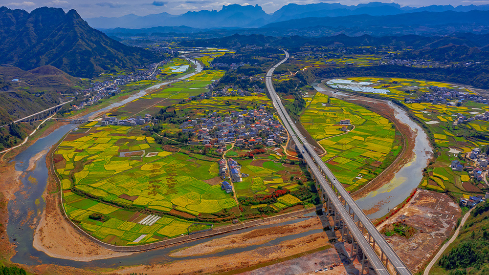 张桑高速公路如巨龙般横跨于太极村金黄的油菜花田与山水之间,与太极村式的村落布局、蜿蜒河流与层叠山峦相映成趣,将工程之美与田园风光完美融合。