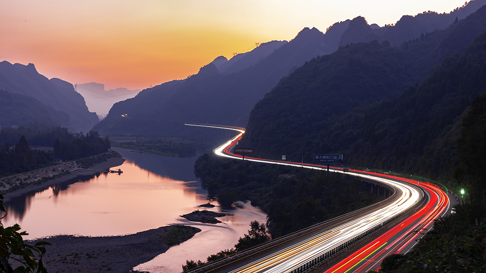 图片说明:傍晚,站在此路段旁的山顶俯瞰狗子滩高架桥,只见公路蜿蜒,车辆穿梭拖曳光影,拍摄采用长曝光,将车辆轨迹凝固为丝绸般的光带,目之所及,公路如绷紧的琴弦,车流光痕似跃动的音符,给人一种“人在车中坐,如在弦上行”的体验,使桥梁从交通设施升华为大地艺术。