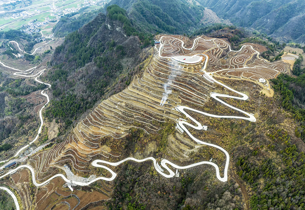 作品拍摄于永定区桥头乡的莓茶种植基地,山坡上产业路如绸带环绕莓茶梯田,乡村振兴铺就的莓园致富产业路。