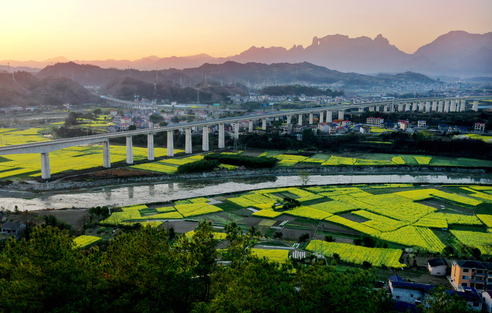 油菜花开的时节,天门山下高速公路纵横在花海中.好一幅壮美的生态画卷。
