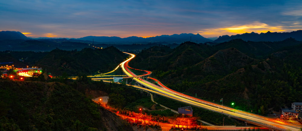 张家界高速西站路段,于暮色中尽显灵动。蜿蜒的公路上车灯划出流光,与远处山峦、天际的霞光相映,周边灯火点缀,在山水间勾勒出交通要道的活力与壮美,宛如大地的绚丽丝带。