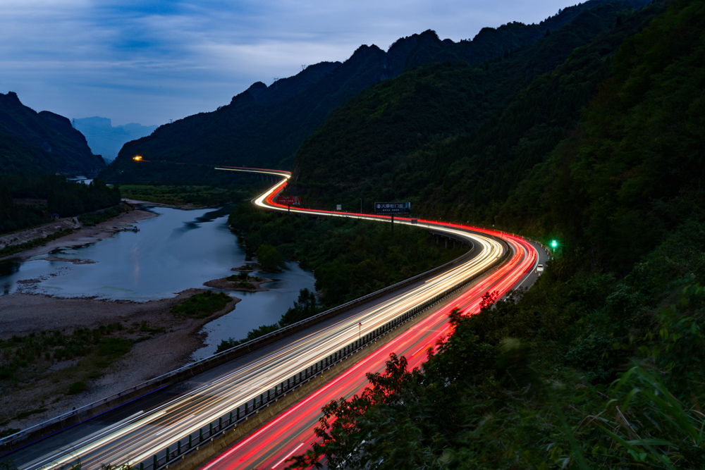 张长高速狗子滩路段,暮色中,公路如绸带蜿蜒。车辆灯光划出红、白流光,与静谧河水、葱郁山峦相映。远山朦胧,近树含翠,光影交织间,尽显山间公路的灵动与山水交融的静谧之美。