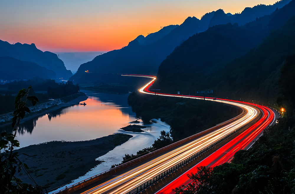 暮色中,山河巍峨,公路上车轨流光蜿蜒,与碧水、远山共绘出一幅静谧又动感的山水交通图景,尽显自然与人文交融的韵律。