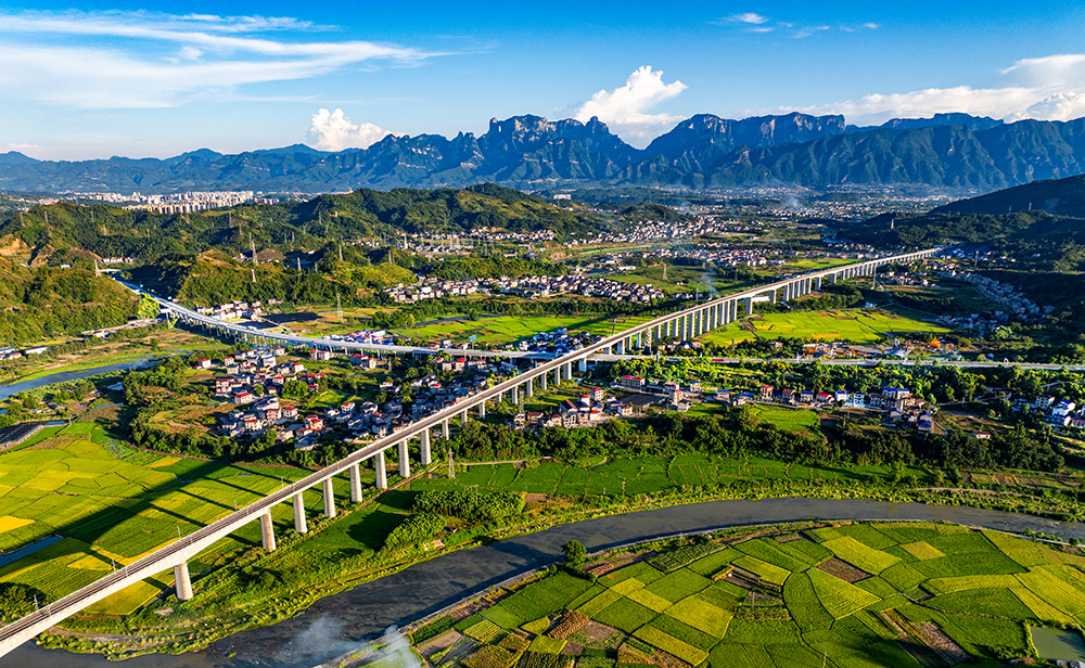 天门山下高铁长虹与公路织就“经纬”,穿村过田与烟火村落镶嵌在田野青绿里,绘就一幅现代交通与乡野风光完美融合的美丽画卷。