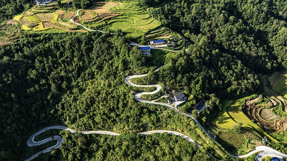 2025年9月拍摄于永定区谢家垭筒车坝传统村。永定谢家垭乡筒车坝村的公路依山而造盘曲而上,缠翠林绕梯田,蜿蜒连起山间人家,是村落的便民通途。