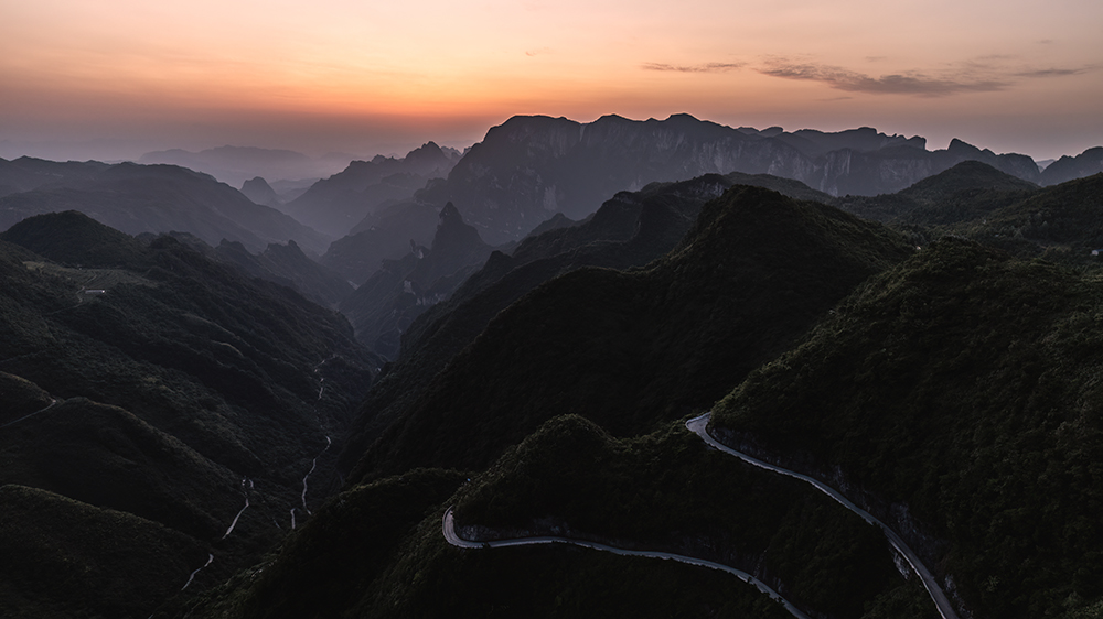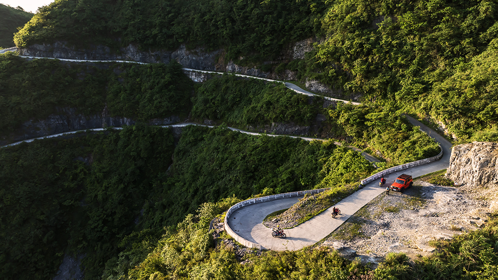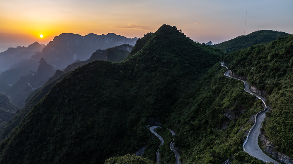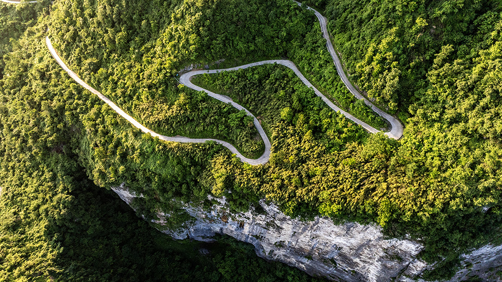 熊壁岩公路是一条镶嵌于悬崖间的挂壁公路,四周层峦叠嶂,远观如褐色腰带缠绕青山,弯道蜿蜒如虬龙,是山乡通途的奇绝图景。航拍于2025年6月。