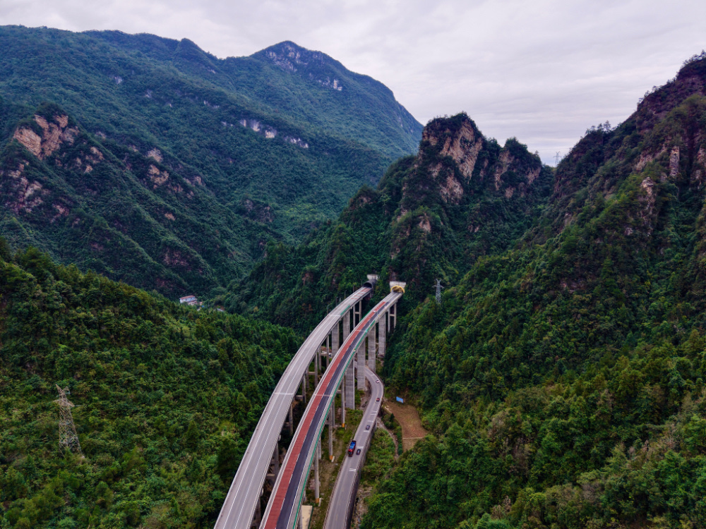 高速公路如银龙穿梭于层峦叠翠的峡谷之境